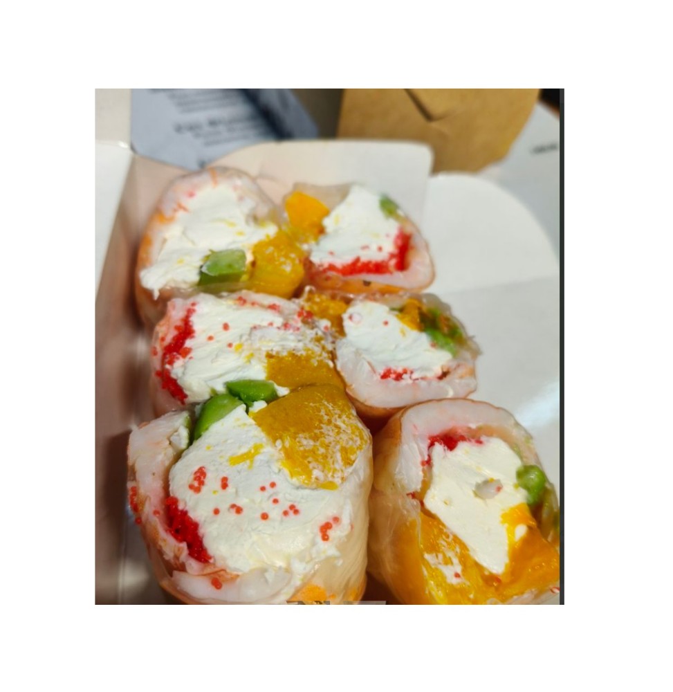 Закуска з крем-сиром, авокадо, огірком, ікрою тобіко, лососем в рисовому папері